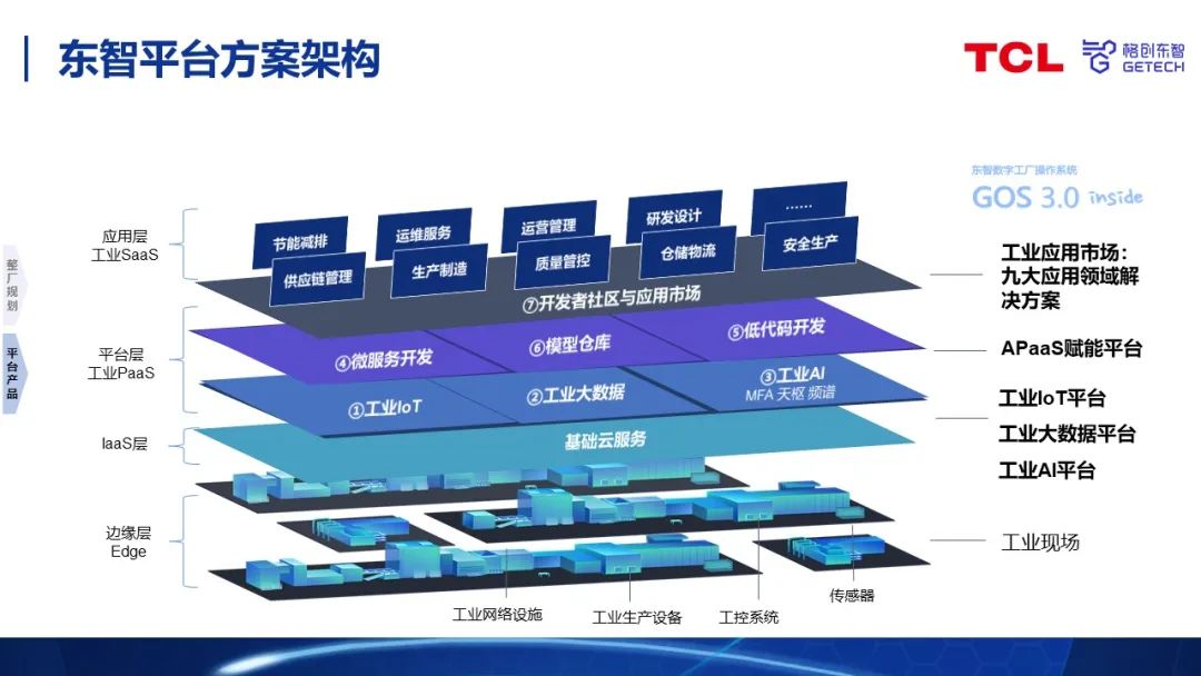 千赢国际东智自主研发的东智工业应用智能平台(简称东智平台),是助力制造业成功构建数字化工厂的关键技术支撑力量,其由GOS工业操作系统(3+1)+工业应用生态组成,基于物联网、大数据、人工智能等三大核心平台能力,南向连接工业生产要素资源,北向基于工业应用快速开发赋能APaaS底座提供工业应用,构建了覆盖全价值链的数字化解决方案。