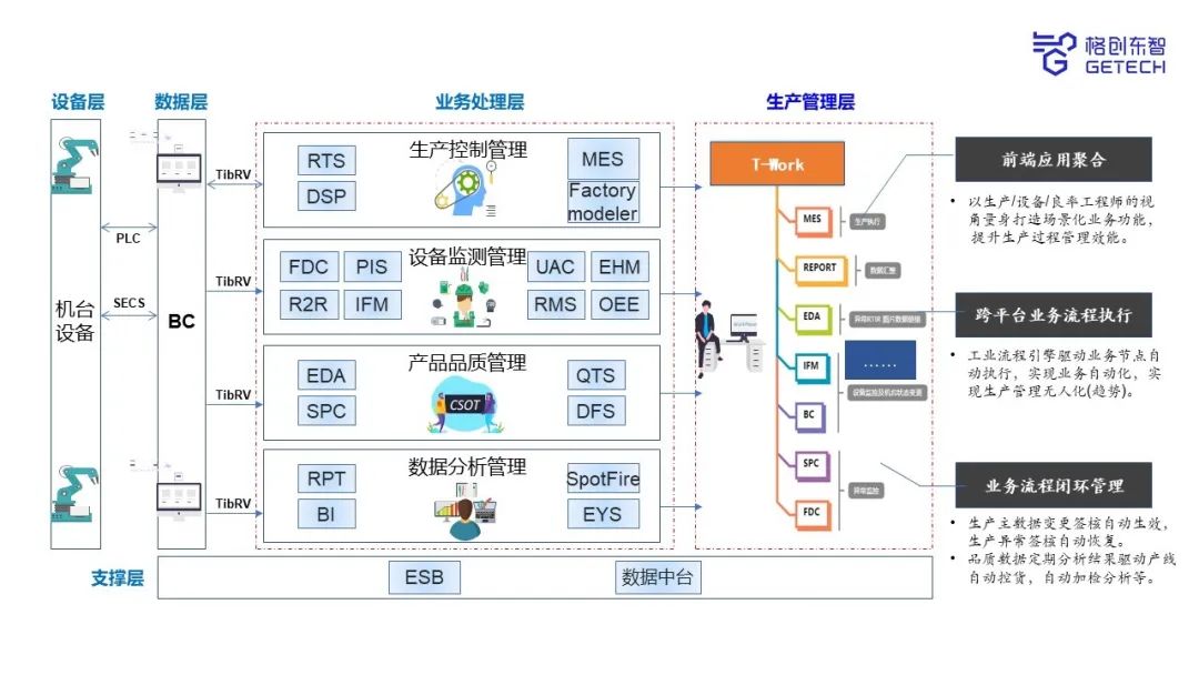基于不同用户群体的业务特性,通过建设常规生产管理系统进行工厂全自动化生产管理,基于设备上报的各类数据进行定性和非定性分析以提升产品品质,根据工厂的设备状态每生产计划及良率波动进行短长期预测,为高层决策提供依据。
