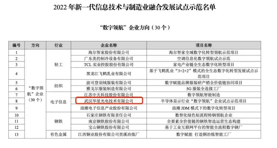 本次评选工信部围绕技术、业务、管理、成效四大方面综合评分,30家企业经过多轮严苛筛选成功入选。武汉华星是湖北省获此殊荣的三家企业之一,凸显了TCL华星整体的数字化经营能力。