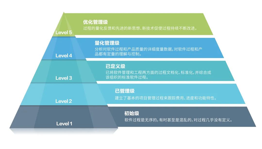 CMMI资质认证分5个等级,从1级到5级,认证级别越高,表示软件组织的能力成熟度越高。