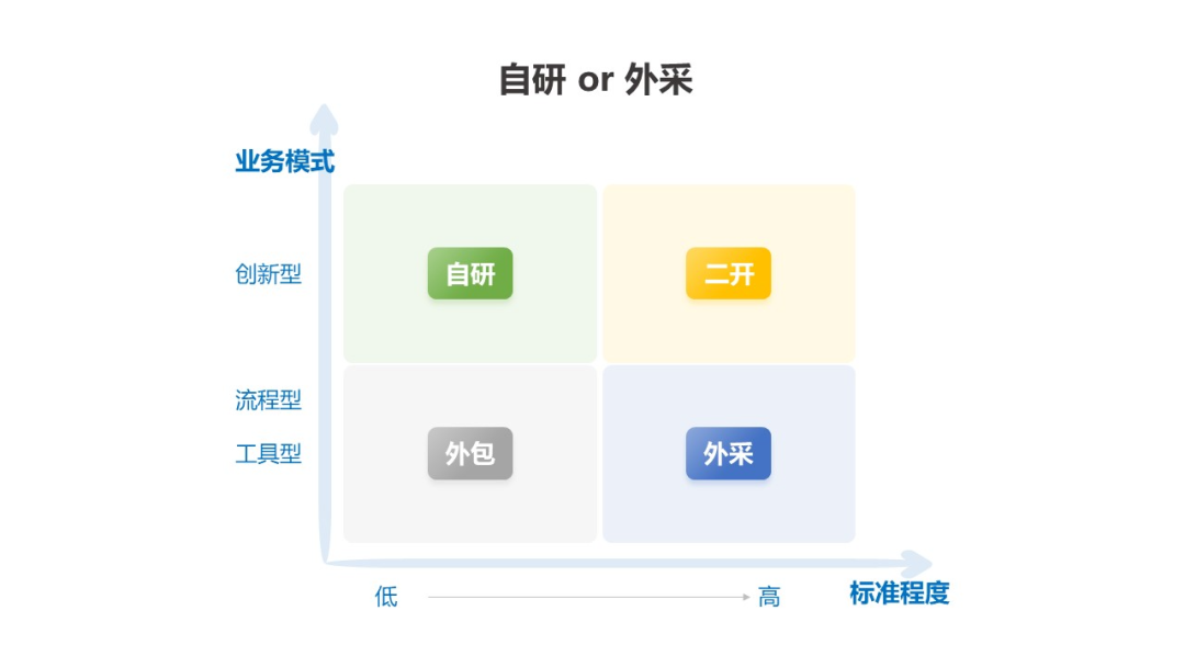 而简单的判断一个软件系统是不是需要自研,可以从是否是创新型业务模式、市场化标准成熟度这两个维度出发, 如下图: