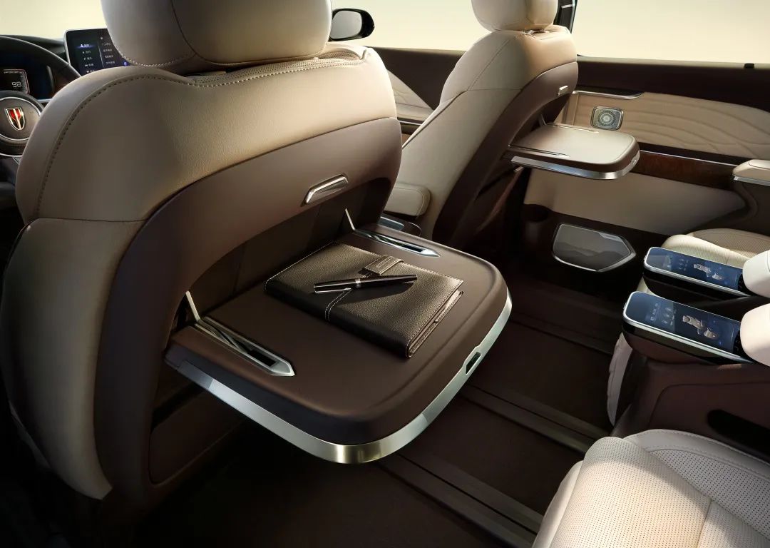 对于红旗HQ9而言,新车的重点都集中在对于第二排乘客的全面照顾。3200毫米的轴距更营造出宽裕的后排空间。进入车内,主动迎宾副板可根据乘客需求于前排、二排滑移,更有可升降香氛随副板向后滑动时升起。