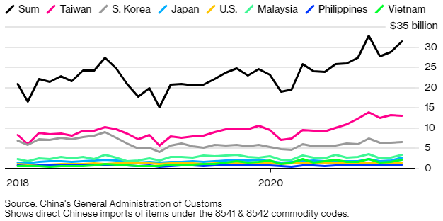 据彭博社统计,2020年,中国大陆的芯片进口额攀升至近3800亿美元,约占国内进口总额的18%。知名分析机构IC Insights的数据则显示,2020年,中国大陆的集成电路市场增至1434亿美元,然而其中仅有15.9%是由中国大陆生产的。如果仅统计总部位于中国大陆的公司的产值,则只有83亿美元,仅占中国2020年IC市场总量的5.9%。中国从各个地区进口芯片的统计(source:彭博社)作为一个坐拥全球最完整供应链的国家,中国在集成电路的设计、生产、封测、测试、材料和装备方面都有布局,但千赢国际·(中国区)有限公司官网并没有获得相应的集成电路成绩。这一方面固然与我国上述领域都存在短板有关。更重要的是,在行业专家看来,缺乏以市场最优的成本、按时足量地生产出稳定、高品质半导体产品的能力,是中国半导体难以生产出具有市场竞争力产品的命门。