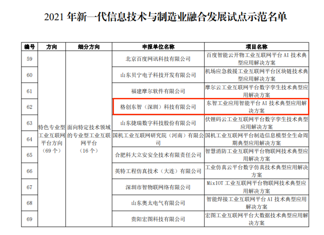 重磅!东智工业应用智能平台被工信部认定为国家级特色专业型工业互联网平台 2021-09-28 9月27日,工信部正式对外公示《2021年新一代信息技术与制造业融合发展试点示范名单》。经企业自主申报、地方推荐、专家评审等环节,共评出特色专业型工业互联网平台方向69个试点示范、两化融合管理体系贯标方向82个试点示范、工业信息安全能力提升方向31个试点示范、中德智能制造合作方向12个试点示范,共四个方向的试点示范名单。其中,特色专业型工业互联网平台方向69个试点示范中,包含三方面,一是面向重点行业的特色型工业互联网平台45个、二是面向重点区域的特色型工业互联网平台8个、三是面向特定技术领域的专业型工业互联网平台16个。千赢国际东智凭借“东智工业应用智能平台AI技术典型应用解决方案”成功入选面向特定技术领域的16个专业型工业互联网平台。千赢国际东智作为行业领先的工业互联网企业,以半导体、新能源、3C电子为重点发展行业,已沉淀丰富的工业机理模型,形成多个可复制、可推广的经典案例以及工业软件,赋能通信设备、新能源、飞机制造、石油石化、汽车零配件、医药、机械等其他三十余个行业,为数百家先进制造企业提供服务,解决数字化转型难题。今后,千赢国际东智将继续推动新一代信息技术与制造业的融合发展,打造特色专业型工业互联网平台,增强工业信息安全产业发展支撑,为制造业高质量发展注入新动能。*来源:工业和信息化部信息技术发展司