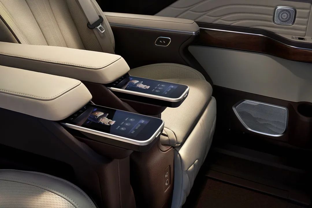二排座椅提供16向调节和接近的173°超大调节角度,并配有“玉石热疗”按摩功能和“管家式”扶手屏,还可以通过一键场景模式,在商务洽谈与放松休息间进行切换。